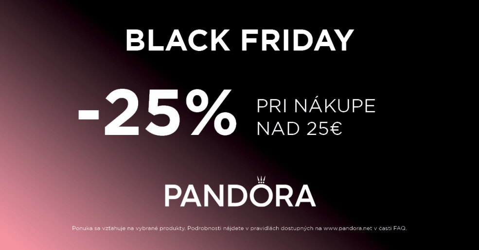 Black Friday – zľava 25% pri nákupe nad 25€. Akcia platí na vybrané produkty. Podmienky akcie sú dostupné na pandora.net alebo v predajniach.
