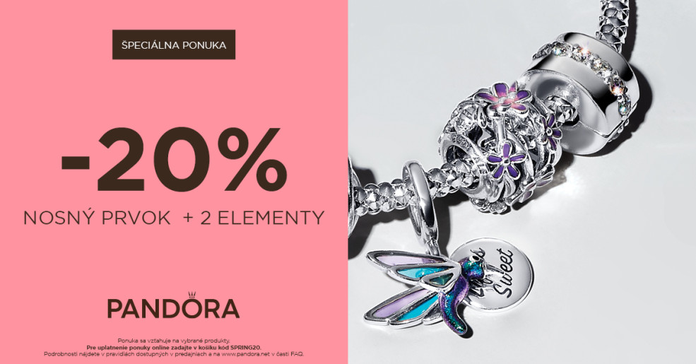 -20% zľava pri nákupe náramku a dvoch príveskov. Promo akcia sa vzťahuje na vybrané produkty. Podmienky akcie sú dostupné v predajniach, alebo online na pandora.net.