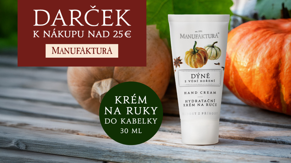 Pri nákupe nad 25 € vám Manufaktura rozdáva mini krém na ruky z limitovanej edície TEKVICA zdarma. Tento voňavý pomocník v praktickej veľkosti poteší kedykoľvek počas dňa – zmestí sa do kabelky aj do vrecka a spoľahlivo sa stará o namáhanú pokožku rúk.
